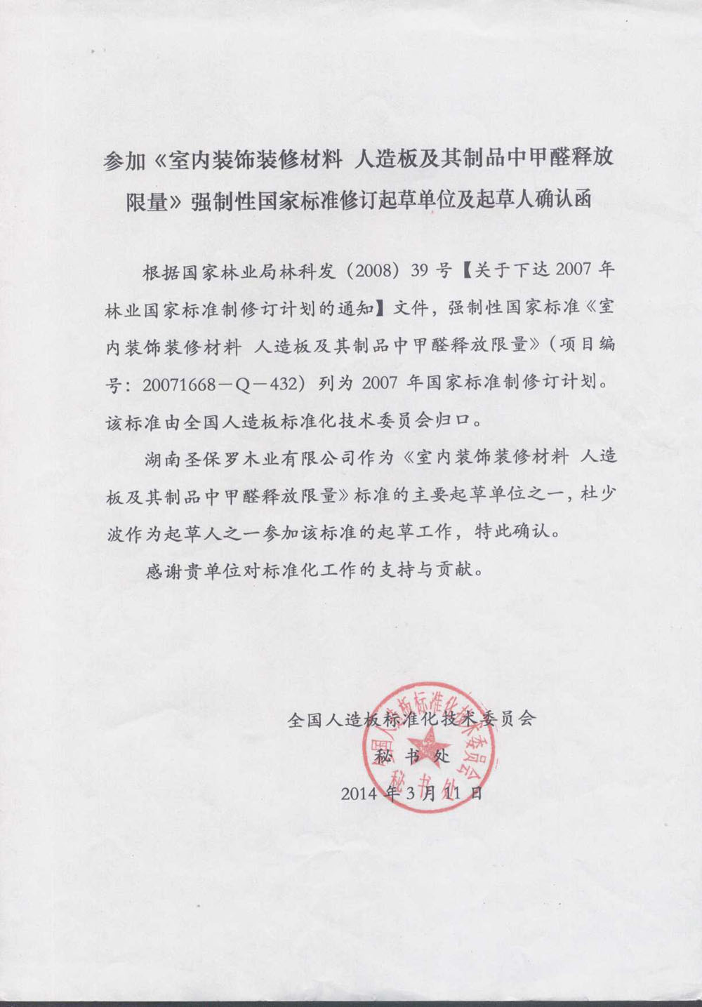 參加《室內裝飾裝修材料 人造板及其制品中甲醛釋放限量》強制性國家標準修訂起草單位及起草人確認函