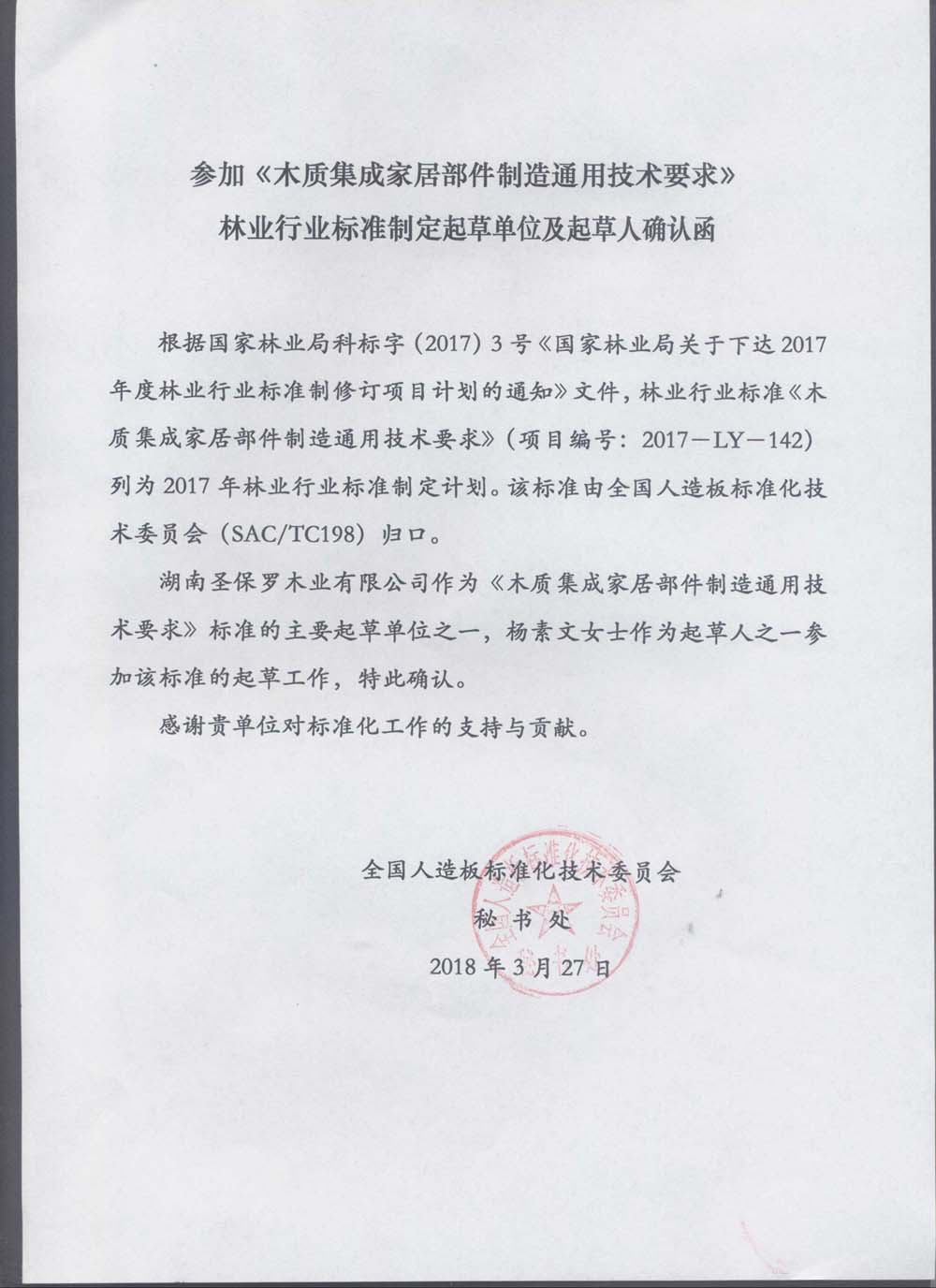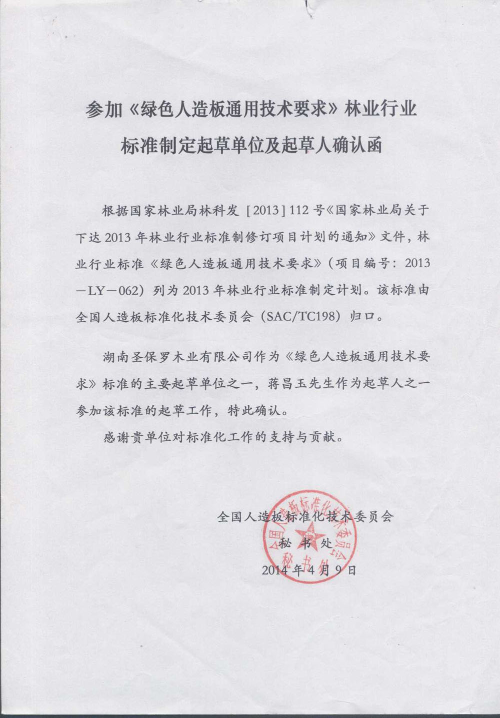 參加《綠色人造板通用技術要求》林業行業標準制定起草單位及起草人確認函