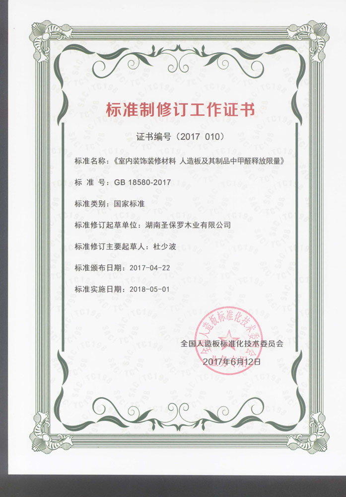 《室內裝飾裝修材料 人造板及其制品中甲醛釋放限量》標準制修訂工作證書