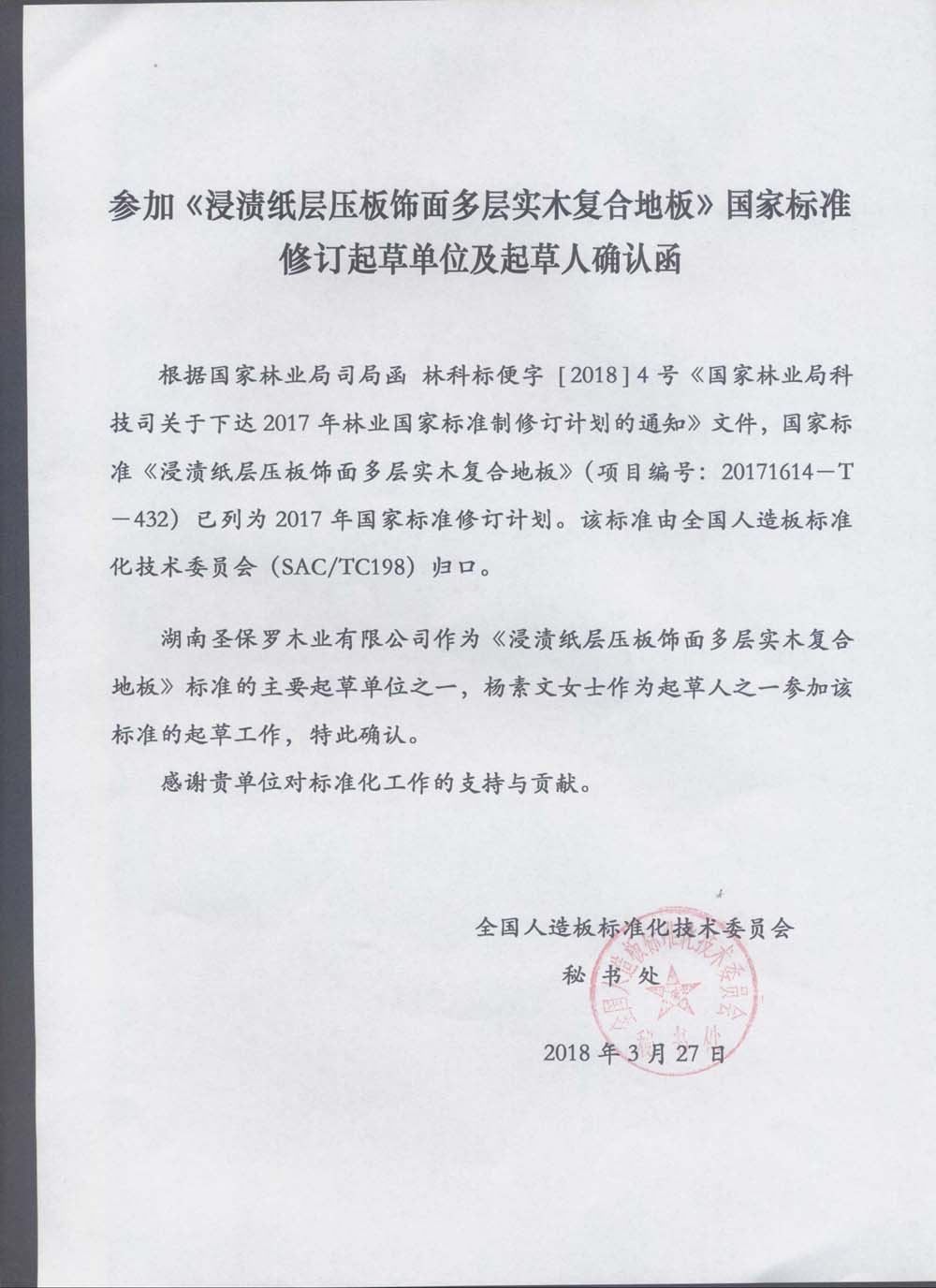 參加《浸漬紙層壓板飾面多層實木復合地板》國家標準修訂起草單位及起草人確認函