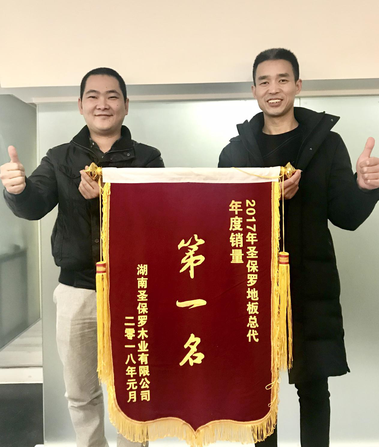 在進(jìn)行廠內(nèi)各部門員工嘉獎(jiǎng)前,對福建圣保羅地板林總單獨(dú)提出表揚(yáng),2017年圣保羅地板總代銷量第一名,恭喜福建圣保羅地板林總!為表彰福建圣保羅地板林總,公司特意頒發(fā)榮譽(yù)錦旗,充分肯定林總這一年的辛苦付出,也感恩林總這一年來對圣保羅的大力支持!