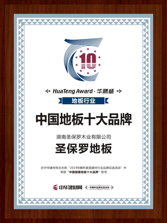 圣保羅地板榮獲2019年華騰杯“中國地板品牌價值十大品牌”