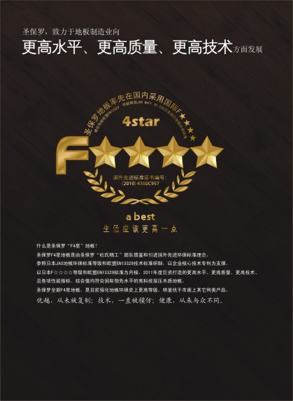 圣保羅F4星地板是由圣保羅“杜氏精工”團隊借鑒和引進國外先進環保標準理念,參照日本JAS地板環保標準等級和歐盟EN13329技術標準研制,以企業核心技術專利為支撐,以日本F☆☆☆☆等級和歐盟EN13329標準為內核,2011年度巨資打造的更高水平、更高質量、更高技術、且各項性能指標、綜合值均符合國際前列水平的高科技層壓木質地板。圣保羅全新F4星地板,是目前強化地板環保史上更高等級,明顯優于市面上其它同類產品。